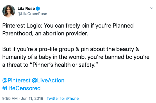 Rose’s tweet reads, “Pinterest Logic: You can freely pin if you’re Planned Parenthood, an abortion provider. / But if you’re a pro-life group and pin about the beauty and humanity of a baby in the womb, you’re banned because you’re a threat to ‘Pinner’s health or safety.’ / @Pinterest / @LiveAction / #LifeCensored.”