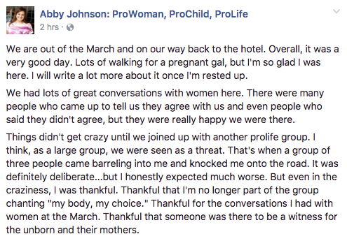 Abby Johnson, prominent pro-life leader who is currently visibly pregnant, was pushed into the street at the Women’s March in Washington D.C., apparently by pro-choicers upset by the presence of pro-lifers at the event. She was then protected by other participants in the march.