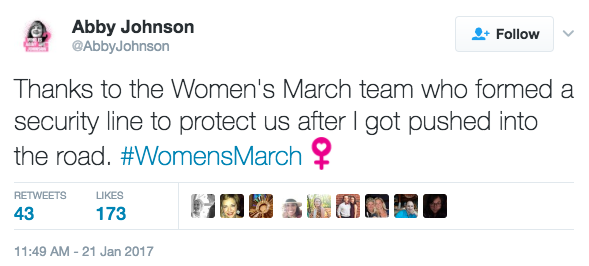 “Thanks to the Women’s March team who formed a security line to protect us after I got pushed into the road,” she wrote on Twitter.
