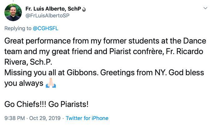 Fr. Luis Alberto, SchP, also tweeted, “Great performance from my former students at the dance team and my great friend and Piarist confrère, Fr. Ricardo Rivera, Sch.P. / Missing you all at Gibbons. Greetings from NY. God bless you always. 🙏🏻 / Go Chiefs!!! Go Piarists!”