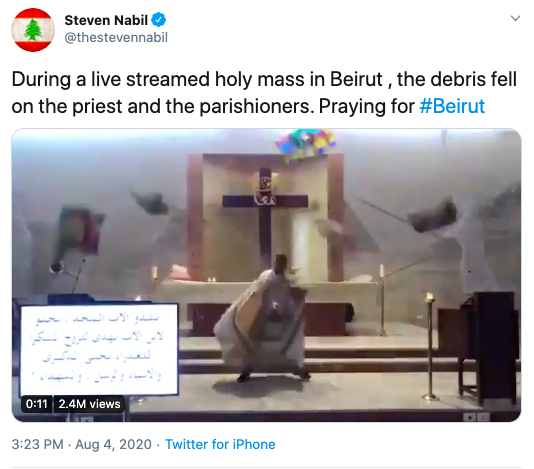 TV news correspondent Steven Nabil wrote on Twitter, “During a live-streamed Holy Mass in Beirut, the debris fell on the priest and the parishioners. Praying for #Beirut.”