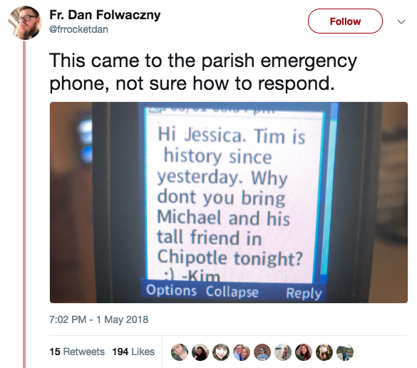 Fr. Folwaczny’s tweet with the picture says: “This came to the parish emergency phone, not sure how to respond.”
