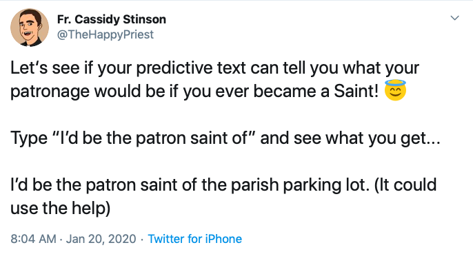 Fr. Stinson’s full text reads, “Let‘s see if your predictive text can tell you what your patronage would be if you ever became a Saint! 😇 / Type “I’d be the patron saint of” and see what you get… / I’d be the patron saint of the parish parking lot. (It could use the help)”.