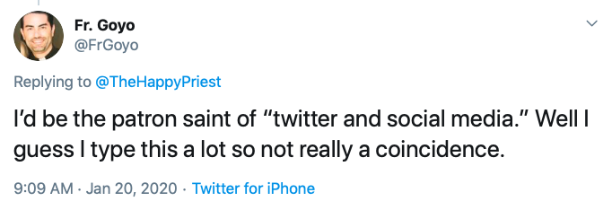 Fr. Goyo Hidalgo responded, “I’d be the patron saint of ‘twitter and social media.’ Well I guess I type this a lot so not really a coincidence.”