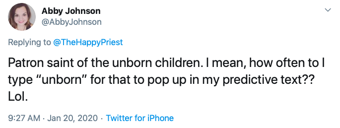 Pro-life advocate Abby Johnson responded, “Patron saint of the unborn children. I mean, how often do I type ‘unborn”’ for that to pop up in my predictive text?? Lol.”