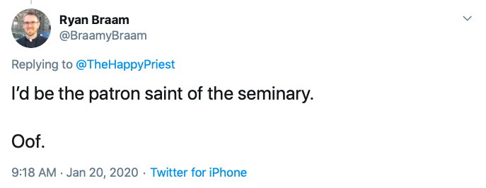 Seminarian for the Archdiocese of Washington Ryan Braam said, “I’d be the patron saint of the seminary. / Oof.”