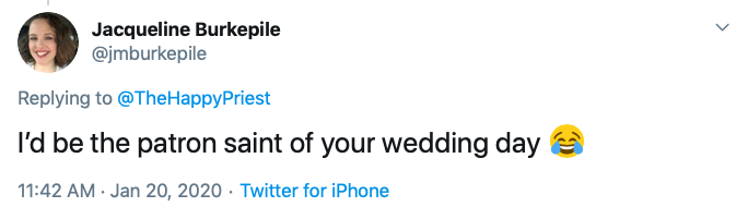 ChurchPOP English editor Jacqueline Burkepile responded, “I’d be the patron saint of your wedding day 😂”.