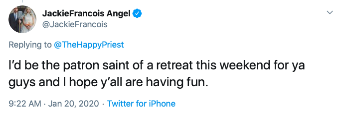 Catholic musician and speaker Jackie Francois Angel said, “I’d be the patron saint of a retreat this weekend for ya guys and I hope y’all are having fun.”