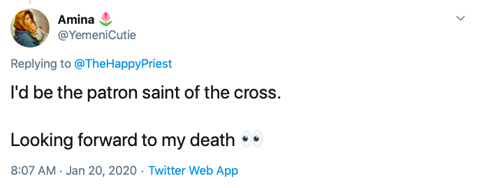 This user also said, “I’d be the patron saint of the cross. / Looking forward to my death. 👀”
