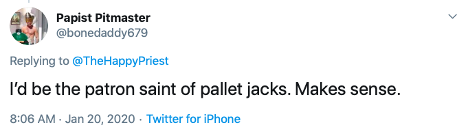 Another user said, “I’d be the patron saint of pallet jacks. Makes sense.”