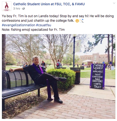 The text of the Catholic Student Union Facebook post reads: “Ya boy Fr. Tim is out on Landis today! Stop by and say hi! He will be doing confessions and just chattin up the college folk.”
