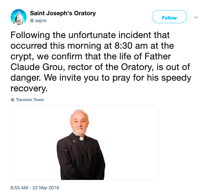 St. Joseph’s Oratory’s tweet reads, “Following the unfortunate incident that occurred this morning at 8:30 am at the crypt, we confirm that the life of Father Claude Grou, rector of the Oratory, is out of danger. We invite you to pray for his speedy recovery,”
