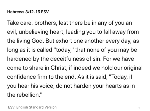 “But exhort one another every day, as long as it is called ‘today,’ that none of you may be hardened by the deceitfulness of sin. For we have come to share in Christ, if indeed we hold our original confidence firm to the end.