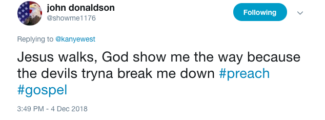 This user tweeted, “Jesus walks, God show me the way because the devil’s tryna break me down #preach #gospel.” (Lyrics from Jesus Walks by Kanye West)