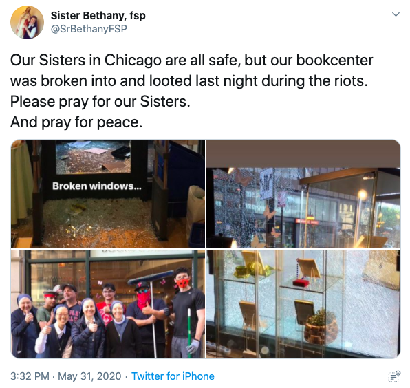Sr. Bethany’s post reads, “Our Sisters in Chicago are all safe, but our book center was broken into and looted last night during the riots. Please pray for our Sisters. And pray for peace.”