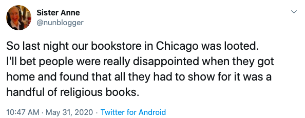 Sr. Anne’s full tweet reads, “So last night our bookstore in Chicago was looted. I’ll bet people were really disappointed when they got home and found that all they had to show for it was a handful of religious books.”