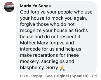 This Facebook user also said, “God forgive your people who use your house to mock you again, forgive those who do not recognize your house as God’s house and do not respect it. Mother Mary, forgive and intercede for us, and help us make reparations for [this] mockery, sacrilegious and blasphemy. Sorry