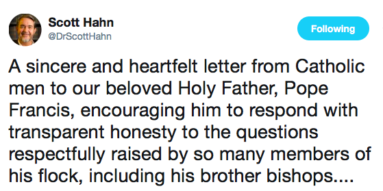 Towards the end of the letter, they state their commitment “to serious and difficult fasting for the next seventeen Fridays, beginning this Friday, September 7 through the end of the calendar year,” adding that they “desire nothing more than to become saints amidst scandal.”