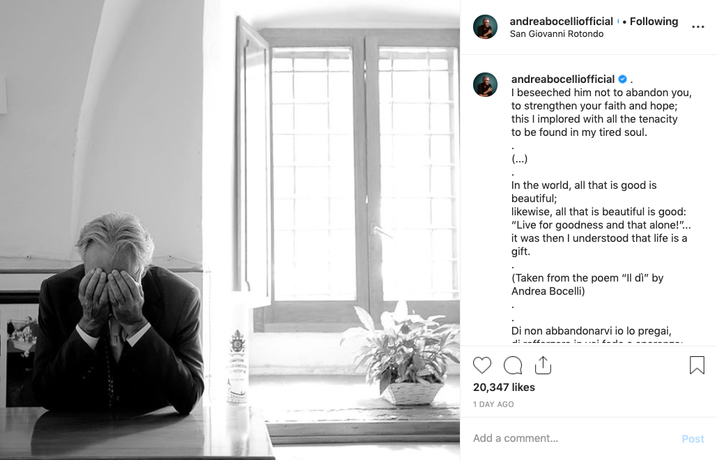 The post’s full text reads, “I beseeched him not to abandon you, / to strengthen your faith and hope; / this I implored with all the tenacity / to be found in my tired soul. / (…) / In the world, all that is good is beautiful; / likewise, all that is beautiful is good: “Live for goodness and that alone!”… it was then I understood that life is a gift. / (Taken from the poem “Il dì” by Andrea Bocelli)”.