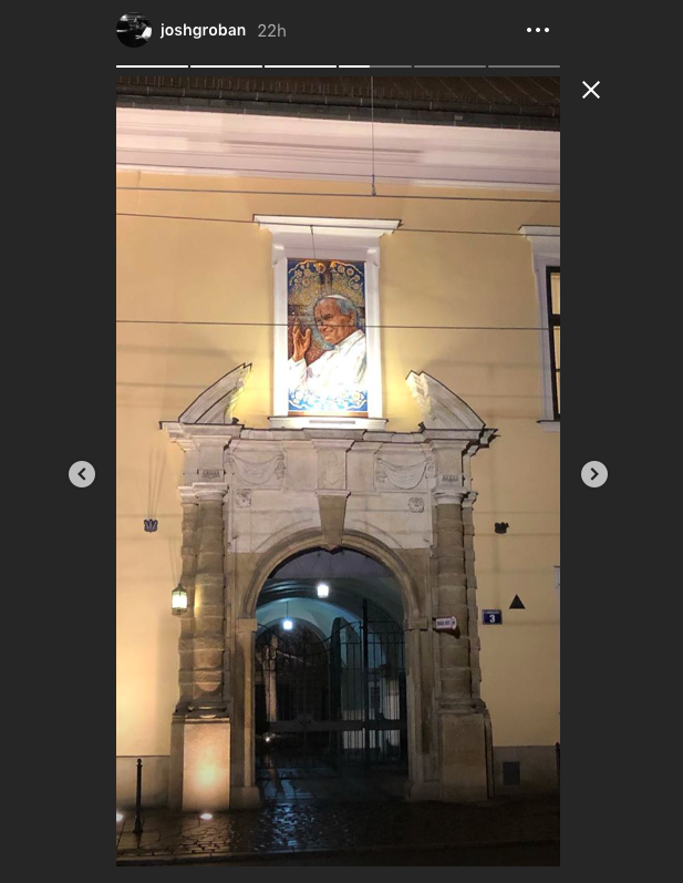 Singer, songwriter, and musician Josh Groban recently posted a photo in his Instagram stories of the Papal Window at the Bishop’s Palace in Krakow, Poland. He was visiting Krakow for his current international tour.