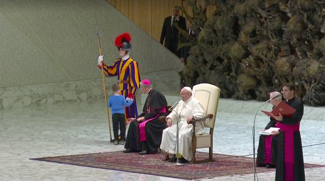 The boy, a seven-year-old Argentinian named Wenzel Eluney first tugged on a swiss guard’s hand, then ran across the stage.