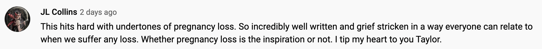 YouTube user JL Collins also wrote, “This hits hard with undertones of pregnancy loss. So incredibly well-written and grief-stricken in a way everyone can relate to when we suffer any loss, whether [or not] pregnancy loss is the inspiration. I tip my heart to you Taylor.”