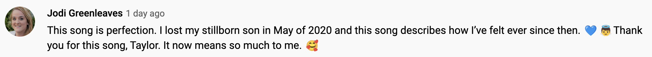 YouTube user Jodi Greenleaves added, “This song is perfection. I lost my stillborn son in May of 2020 and this song describes how I’ve felt ever since then. Thank you for this song, Taylor. It now means so much to me.”