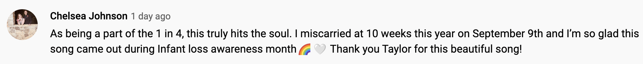 “As being a part of the 1 in 4, this truly hits the soul,” YouTube user Chelsea Johnson shared. “I miscarried at 10 weeks this year on September 9th and I’m so glad this song came out during Infant Loss Awareness Month. Thank you, Taylor for this beautiful song!”