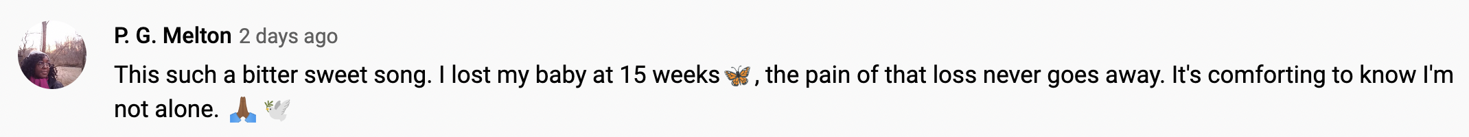 YouTube user P.G. Melton added, “This such a bitter sweet song. I lost my baby at 15 weeks. The pain of that loss never goes away. It’s comforting to know I’m not alone.”