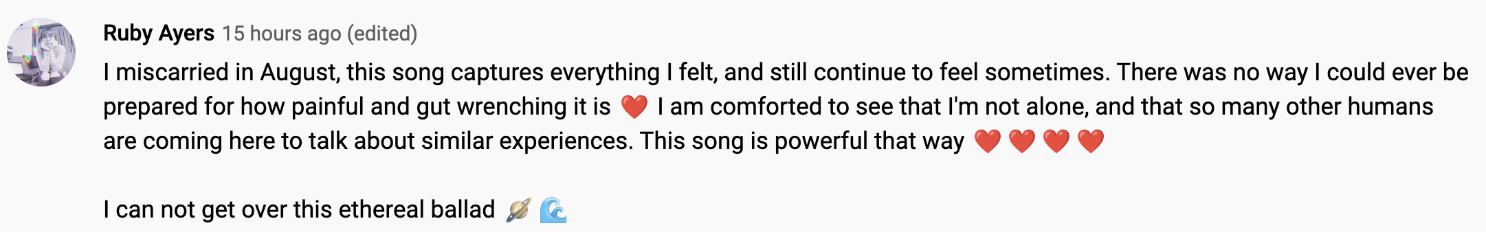 YouTube user Ruby Ayers also wrote, “I miscarried in August, this song captures everything I felt, and still continue to feel sometimes. There was no way I could ever be prepared for how painful and gut-wrenching it is. I am comforted to see that I’m not alone, and that so many other humans are coming here to talk about similar experiences. This song is powerful that way. / I can not get over this ethereal ballad.”