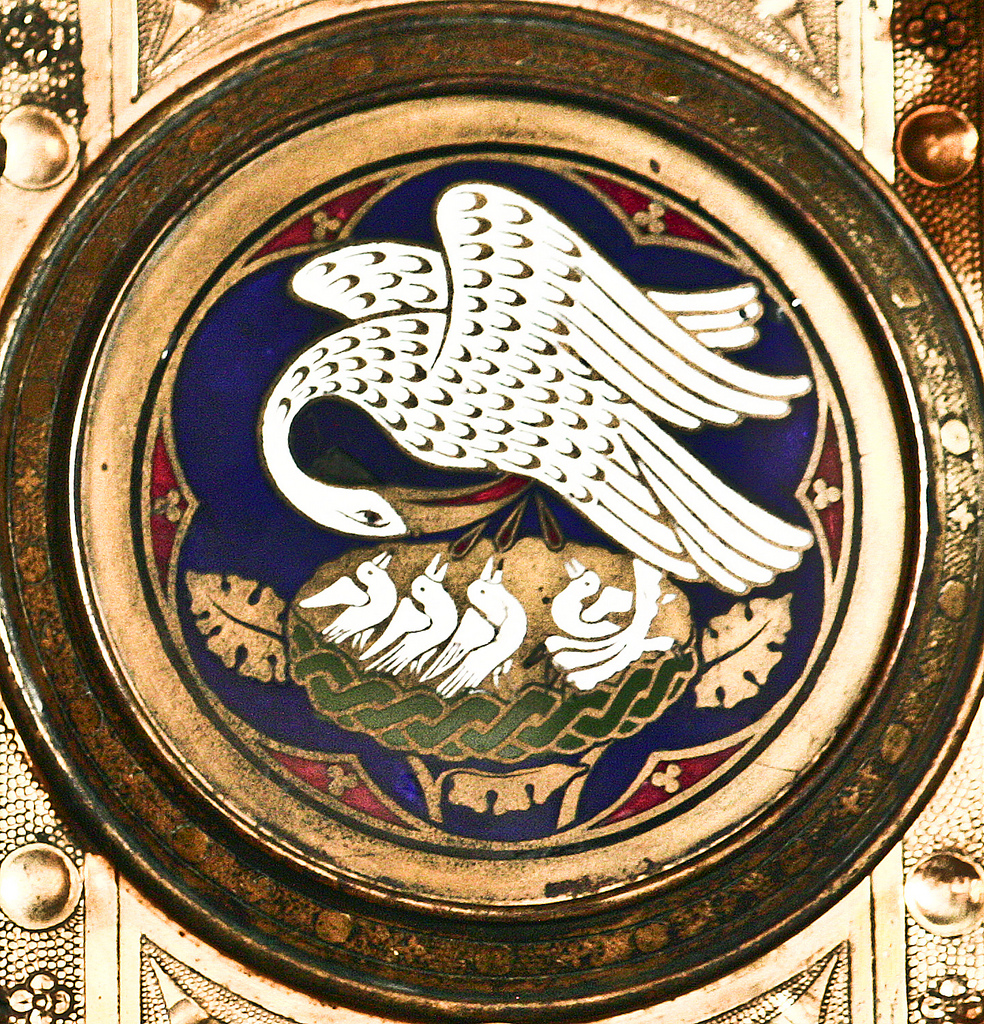 This supposed feature of pelican life – called a “pelican in her piety” – was seen as a perfect symbol of Christ’s sacrifice on the cross and the Eucharist: just as the pelican would give its blood to save its children, so Christ poured out his blood on the cross to save us from our sins and offers his blood to us in the Eucharist as a spiritual drink.