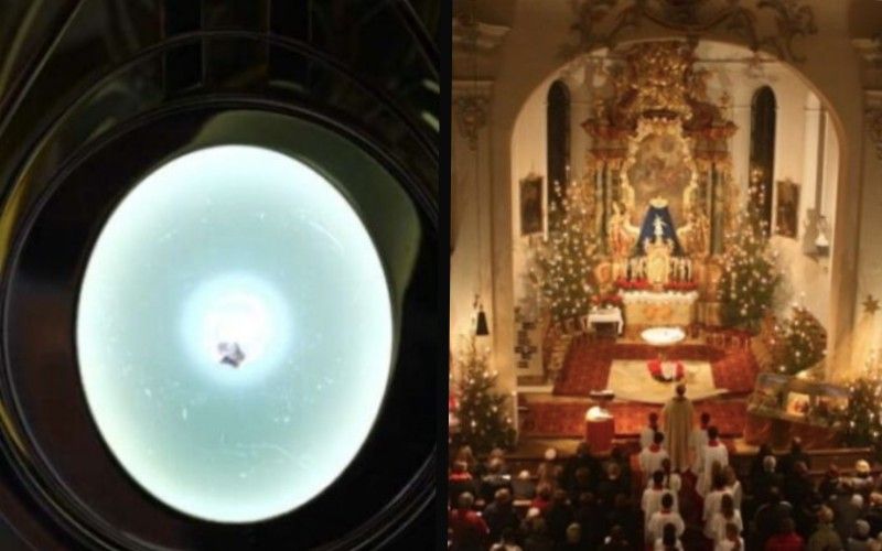 During communion, a host fell on the floor. Following the Church’s instructions to respect the sacred host, the priest placed the Eucharist in holy water to dissolve.