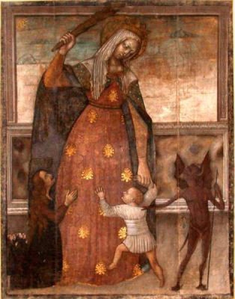 Here are two iconic depictions of Mary fighting off demons (who lead souls astray with heresy) with a club: