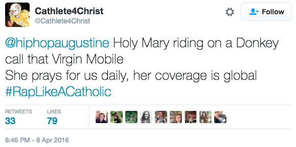 The Twitter username is a play on the full name often used to refer to the saint, Augustine of Hippo (he was the bishop of the North African city Hippo). “Hippo” is changed to “Hiphop” and the account mostly tweets short raps about Catholic theology. It currently has more than 17,000 followers.