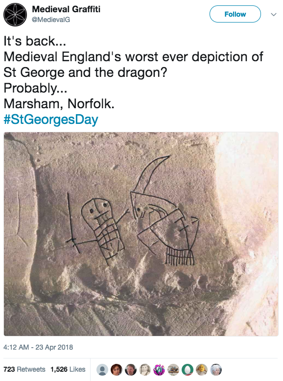 The text reads: “It’s back… Medieval England’s worst ever depiction of St George and the dragon? Probably… Marsham, Norfolk. #StGeorgesDay”.