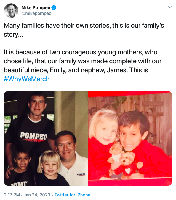 United States Secretary of State Mike Pompeo also tweeted his support for the March for Life.