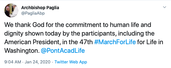 Archbishop Paglia’s full post reads, “We thank God for the commitment to human life and dignity shown today by the participants, including the American President, in the 47th #MarchForLife for Life in Washington. @PontAcadLife“.
