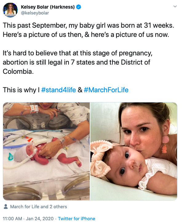 Along with two photos of her daughter, Bolar wrote, “This past September, my baby girl was born at 31 weeks. Here’s a picture of us then, and here’s a picture of us now. / It’s hard to believe that at this stage of pregnancy, abortion is still legal in seven states and the District of Colombia. / This is why I #stand4life and #MarchForLife”.