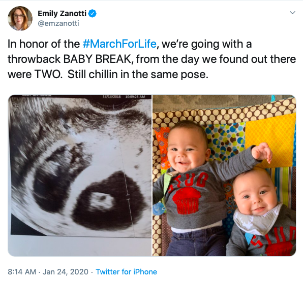 Along with photos of her twin babies, Zanotti tweeted, “In honor of the #MarchForLife, we’re going with a throwback BABY BREAK, from the day we found out there were TWO. Still chillin’ in the same pose.”