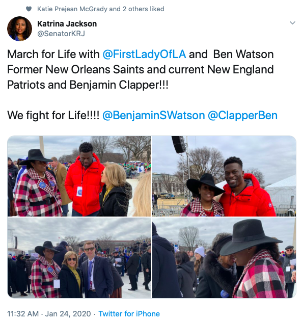 Departing Democratic Louisiana Rep. Katrina Jackson tweeted her March for Life support with Louisiana First Lady Donna Edwards, Louisiana Right to Life Executive Director Benjamin Clapper, and NFL player Ben Watson.