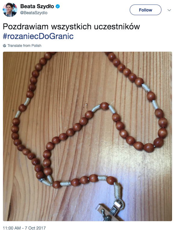 Translated to English, her tweet reads, “I greet all the participants,” and the hashtag translates to “rosary on the borders.” As of this writing, the tweet had been retweeted over 800 times and liked over 3400 times.