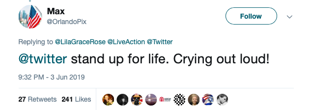 This user said, “@twitter stand up for life. Crying out loud!”