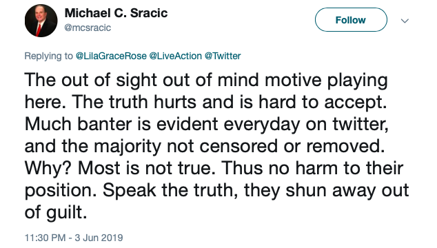 This user added, “The out of sight out of mind motive playing here. The truth hurts and is hard to accept. Much banter is evident everyday on twitter, and the majority not censored or removed. Why? Most is not true. Thus no harm to their position. Speak the truth, they shun away out of guilt.”