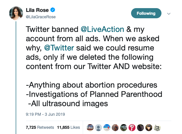 My account and @LiveAction‘s account have been banned from advertising for years. Because we’re pro-life.
