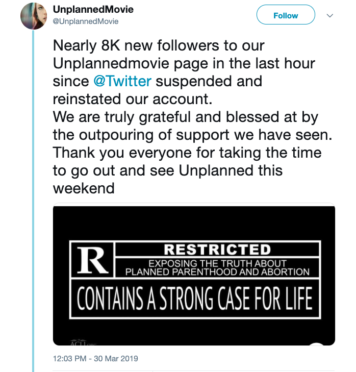 The tweet reads, “Nearly 8K new followers to our Unplannedmovie page in the last hour since @Twitter suspended and reinstated our account. / We are truly grateful and blessed at by the outpouring of support we have seen. / Thank you everyone for taking the time to go out and see Unplanned this weekend.”