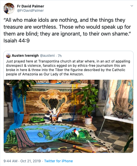 He said, “Just prayed here at Transpontina church at altar where, in an act of appalling disrespect and violence, fanatics egged on by ethics-free journalism this [morning] broke in here and threw into the Tiber the figurine described by the Catholic people of Amazonia as Our Lady of the Amazon.”