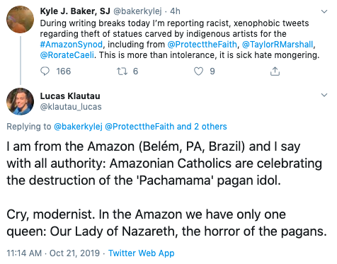 One user claiming to be from the Amazon responded to a journalist accusing other twitter users of “racist, xenophobic tweets regarding theft of statues carved by indigenous artists.”