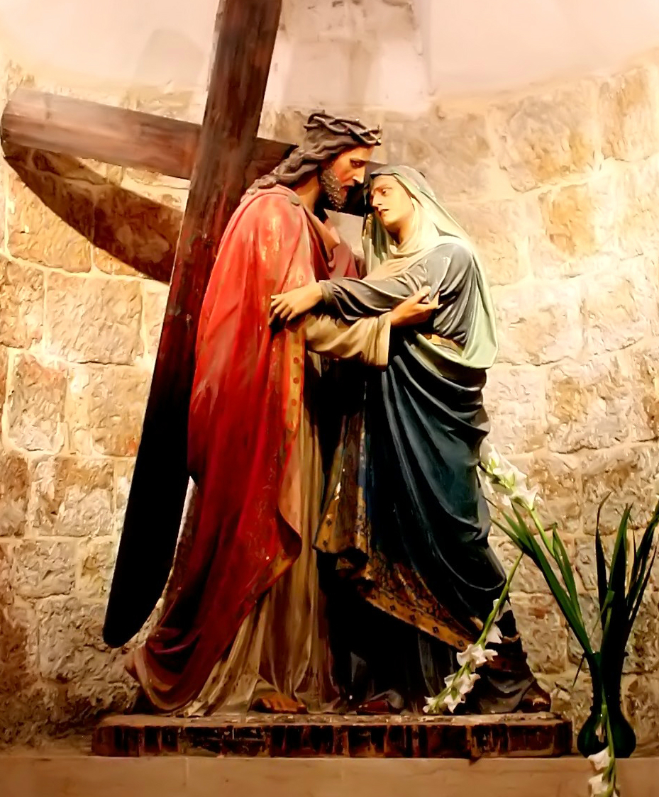 Meditation: As Jesus walks the way of the cross, He meets his mother, whose love soothes His pain for a moment.