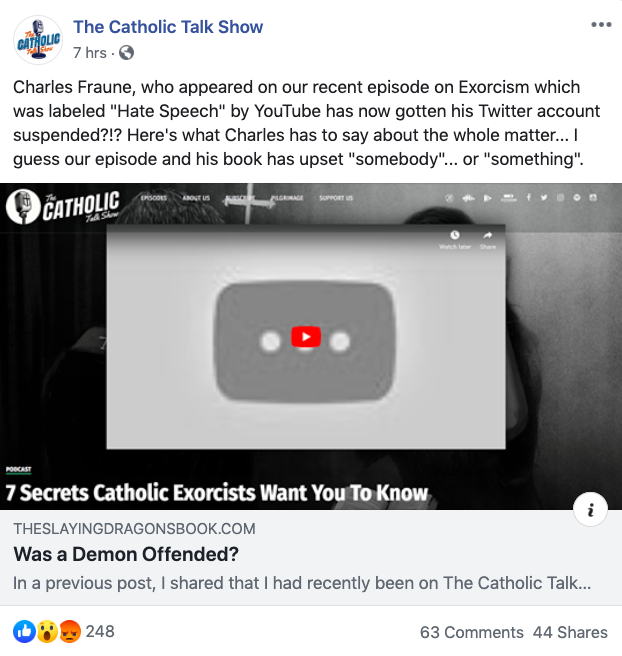 With a link to Fraune’s recent blog post addressing this issue, The Catholic Talk Show writes, “Charles Fraune, who appeared on our recent episode on exorcism, which was labeled “Hate Speech” by YouTube, has now gotten his Twitter account suspended?!? Here’s what Charles has to say about the whole matter… I guess our episode and his book has upset ‘somebody’… or ‘something.'”