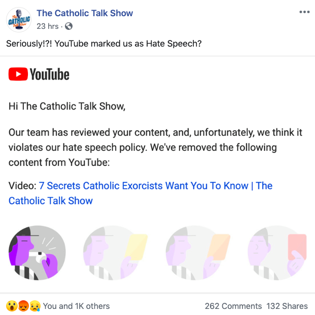 However, YouTube removed the episode, citing a hate speech violation. The Catholic Talk Show posted a photo of the incident.